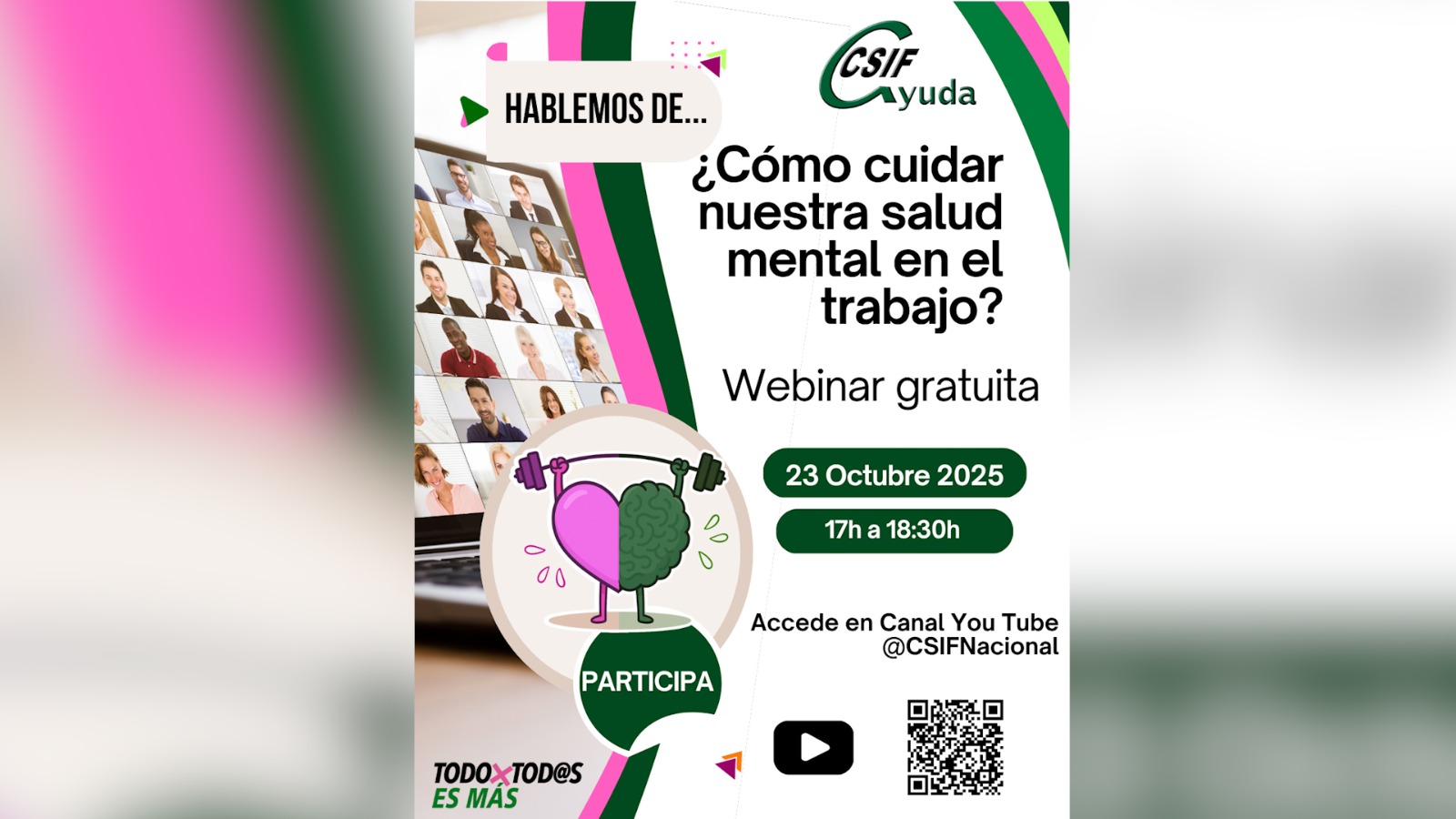 Desde el Gabinete CSIF Ayuda se lanza un nuevo ciclo de Webinars “Hablemos de….” sobre temas relacionados con la salud mental (autocuidado, derechos laborales, inteligencia emocional, depresión, suicidio, agresiones, etc.), es esencial para concienciar, formar y empoderar a los trabajadores frente a los riesgos psicosociales que hoy son una de las principales causas de baja laboral. Estos espacios permiten ofrecer información clara y accesible sobre cómo detectar el estrés, la ansiedad o el acoso, fomentar hábitos saludables y difundir sus derechos laborales.