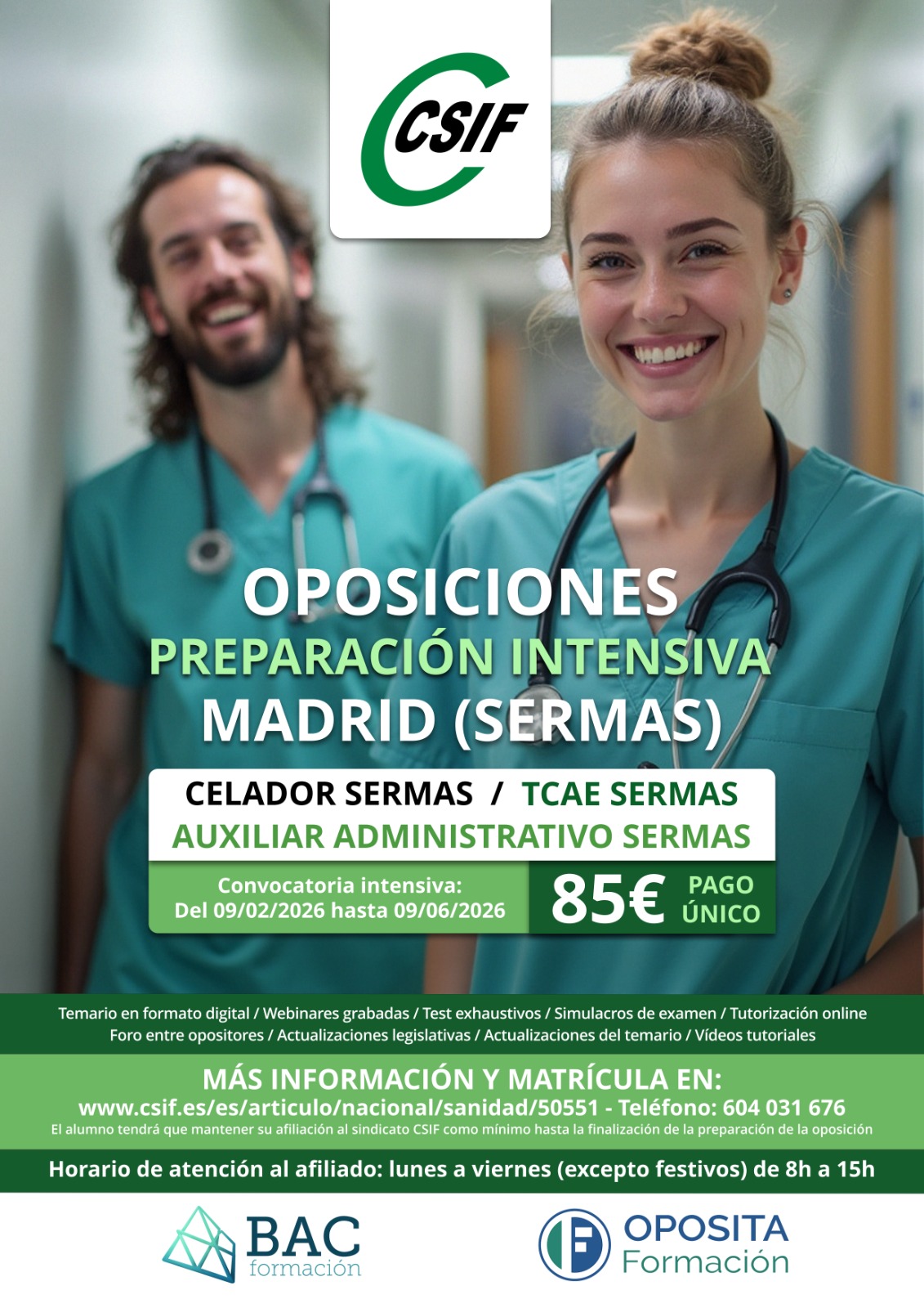 Oposiciones preparación intensiva online Sermas: celador, TCAE y auxiliar administrativo