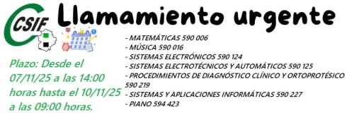 LLAMAMIENTO URGENTE: 17/10/2025. Varias especialidades