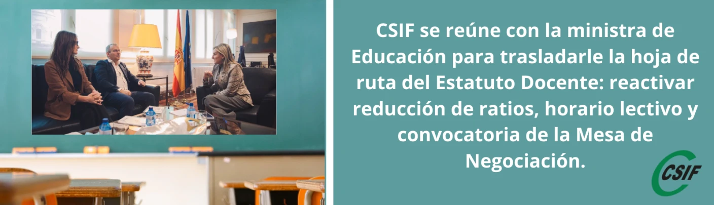 CSIF se reúne con la ministra de Educación para trasladarle la hoja de ruta del Estatuto Docente: reactivar reducción de ratios, horario lectivo y convocatoria de la Mesa de Negociación.
