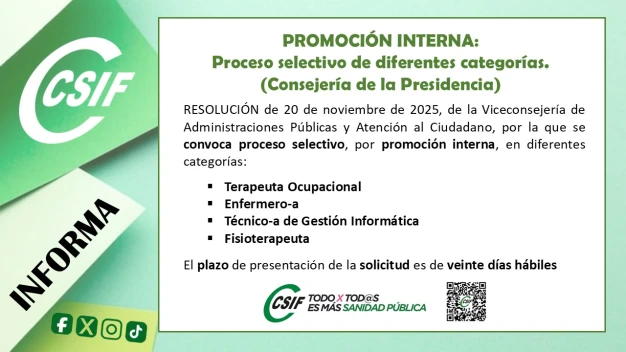 PROMOCIÓN INTERNA: Proceso selectivo en la categoría profesional de Terapeuta Ocupacional, Enfermero-a, Técnico-a de Gestión Informática y de fisioterapeuta de la Administración. (Consejería de la Presidencia)