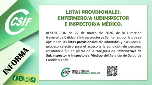 Listas provisionales: personal estatutario fijo en plazas de la categoría de Enfermero/a Subinspector y de Inspector/a Médico.