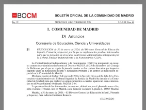 Anuncio emplazamiento contencioso administrativo contra el decreto de cambio de jornada a partida Comunidad de Madrid