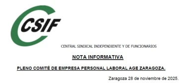 Comité de Empresa Personal Laboral AGE Zaragoza. Nota Informativa CSIF del Pleno del 28-11-25