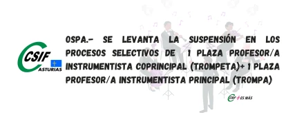 OSPA.- Se levanta la suspensión en los procesos selectivos de 1 plaza Profesor/a Instrumentista Coprincipal (Trompeta)+ 1 plaza Profesor/a Instrumentista Principal (Trompa)