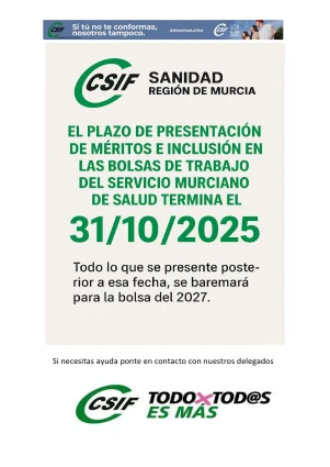 CSIF Sanidad Región de Murcia: plazo presentación de méritos SMS