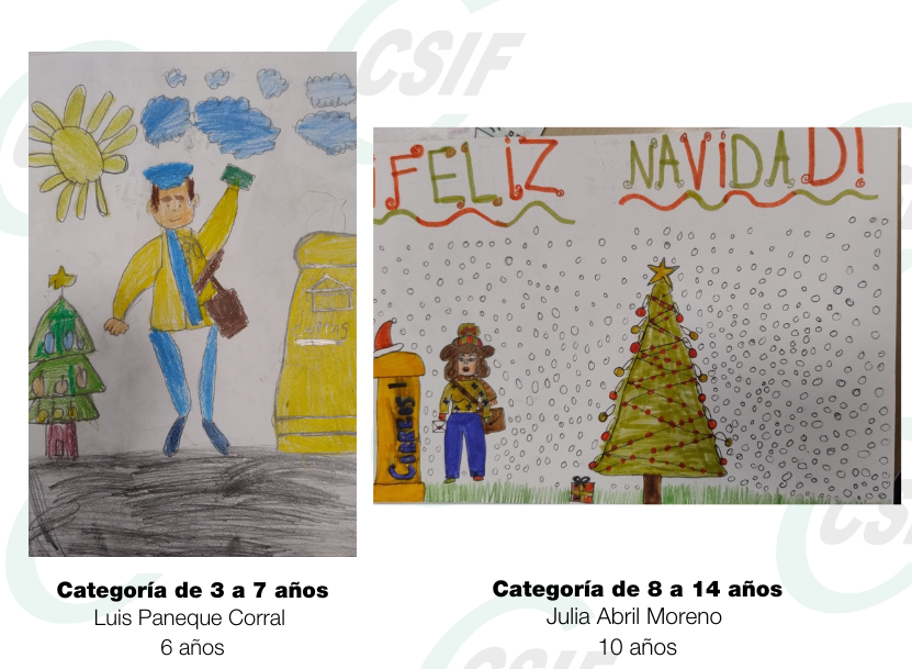 Los ganadores de las dos categorías que establecían las bases de este certamen han sido Luis Paneque Corral de 6 años de edad, en la categoría de 3 a 7 años, y Julia Abril Moreno de diez años, en la categoría de 8 a 14 años. Los dos dibujos serán la portada de las tarjetas navideñas que CSIF EPE Andalucía remitirá en los próximos días a las trabajadoras y trabajadores de Correos en la comunidad.