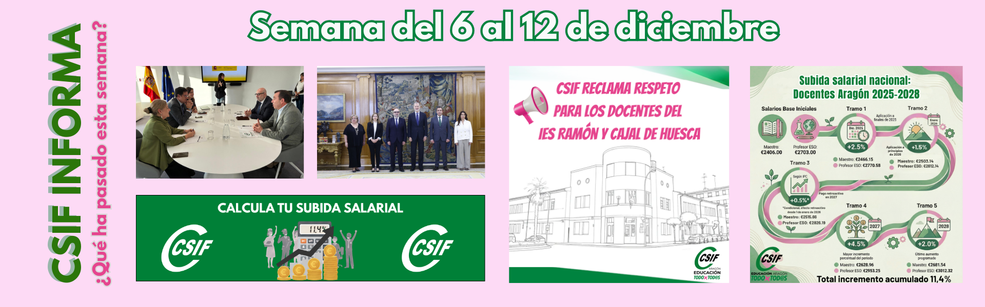 • CSIF denuncia la situación vergonzosa y repetida que está viviendo el profesorado del IES Ramón y Cajal de Huesca por actuaciones injustificadas e incoherentes de parte de la inspección educativa. Tras un año de cambios constantes de criterio y exigencias contradictorias, ahora, en plena primera evaluación, se vuelve a exigir modificar programaciones previamente aprobadas, sin cambio de normativa y solicitando elementos que no aparecen en ninguna ley vigente.