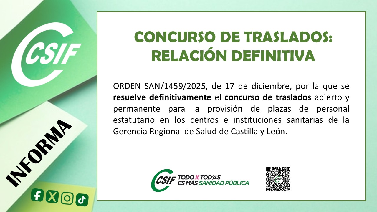 ORDEN SAN/1459/2025, de 17 de diciembre, por la que se resuelve definitivamente el concurso de traslados abierto y permanente para la provisión de plazas de personal estatutario en los centros e instituciones sanitarias de la Gerencia Regional de Salud de Castilla y León.