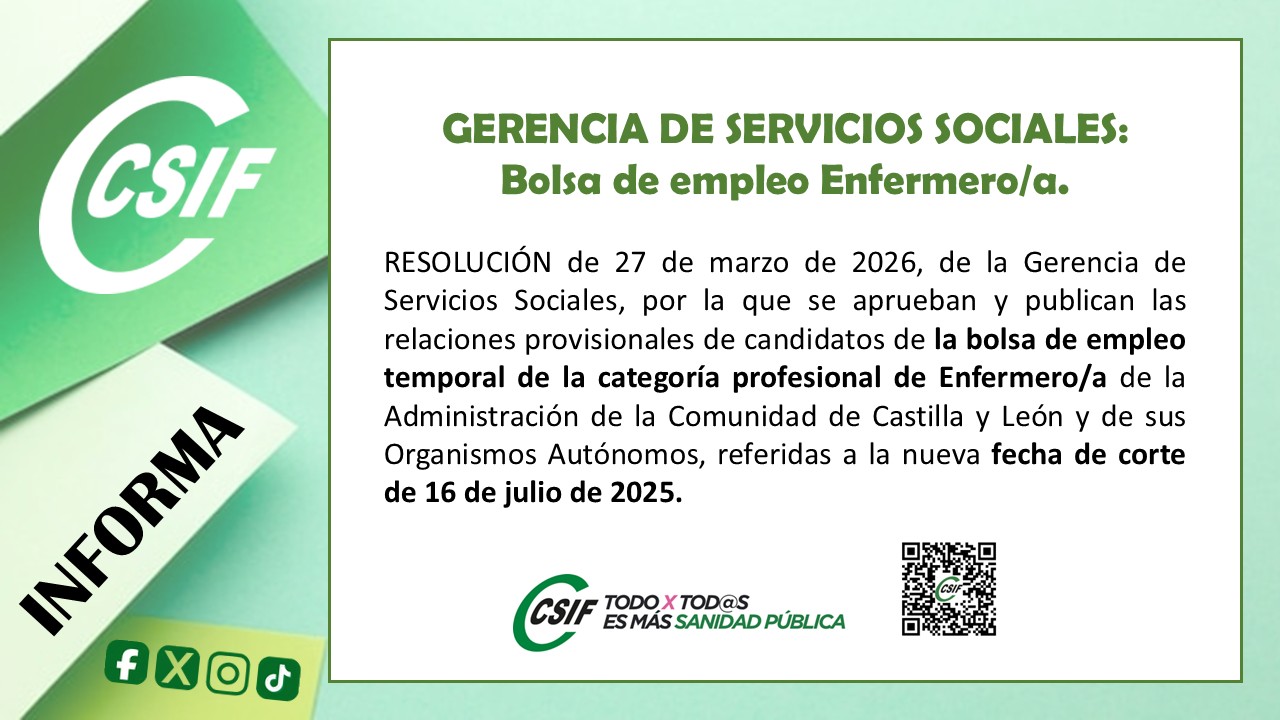 RESOLUCIÓN de 27 de marzo de 2026, de la Gerencia de Servicios Sociales, por la que se aprueban y publican las relaciones provisionales de candidatos de la bolsa de empleo temporal de la categoría profesional de Enfermero/a de la Administración de la Comunidad de Castilla y León y de sus Organismos Autónomos, referidas a la nueva fecha de corte de 16 de julio de 2025.