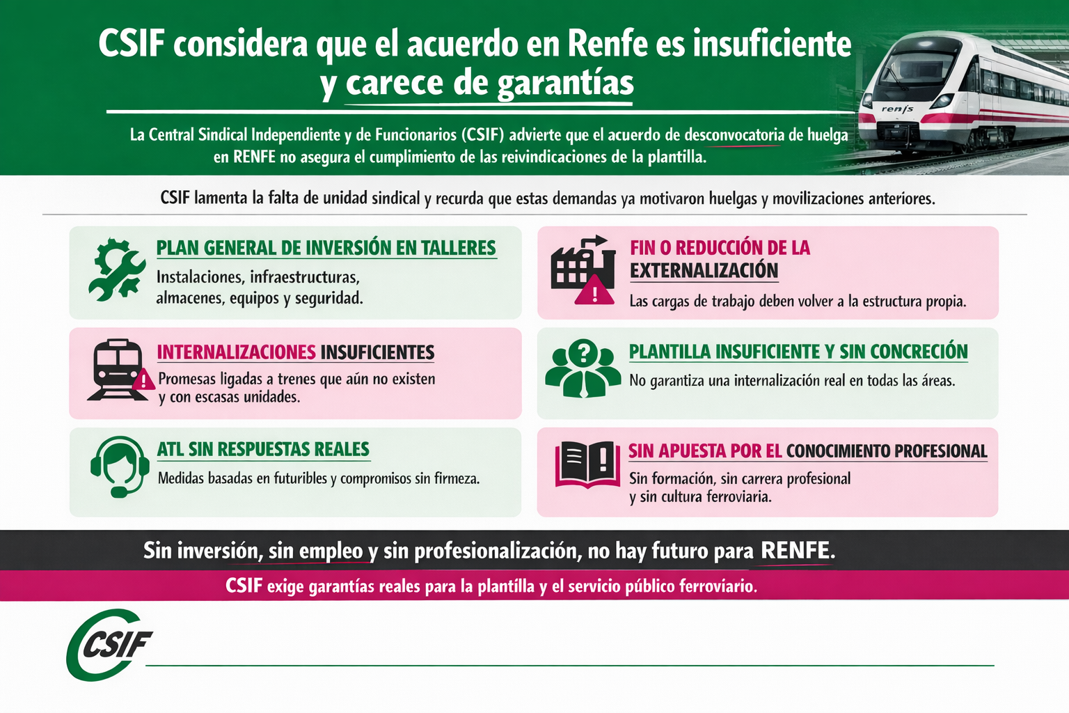 La Central Sindical Independiente y de Funcionarios (CSIF), sindicato más representativo en las administraciones públicas, considera que el acuerdo de desconvocatoria de huelga en RENFE es insuficiente y carece de garantías para su cumplimiento.