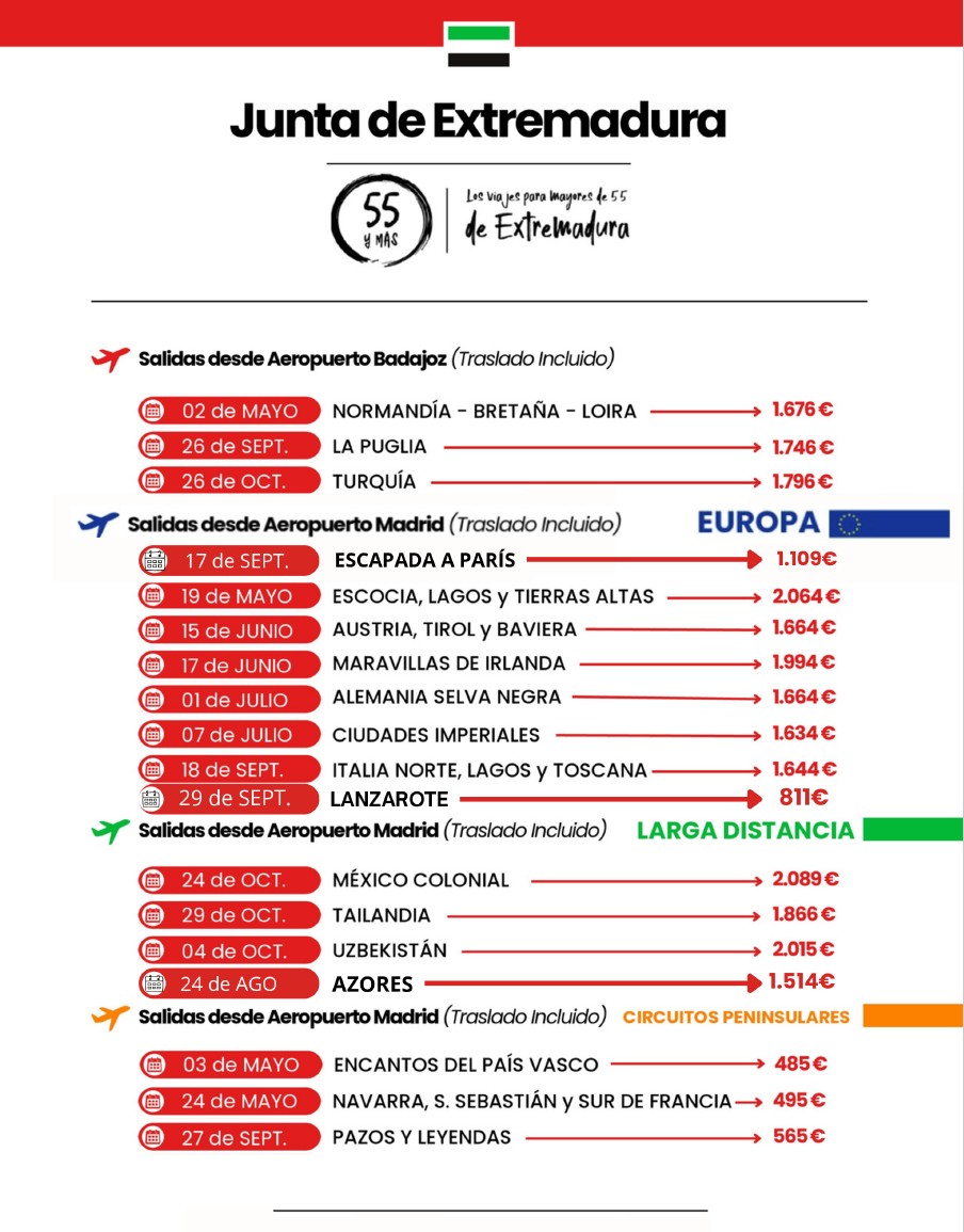 Diseñado para personas activas mayores de 55 años, este programa te lo pone fácil: viajes organizados, acompañamiento y traslado incluido desde Badajoz o Madrid. Tú solo tienes que elegir destino… y disfrutar.