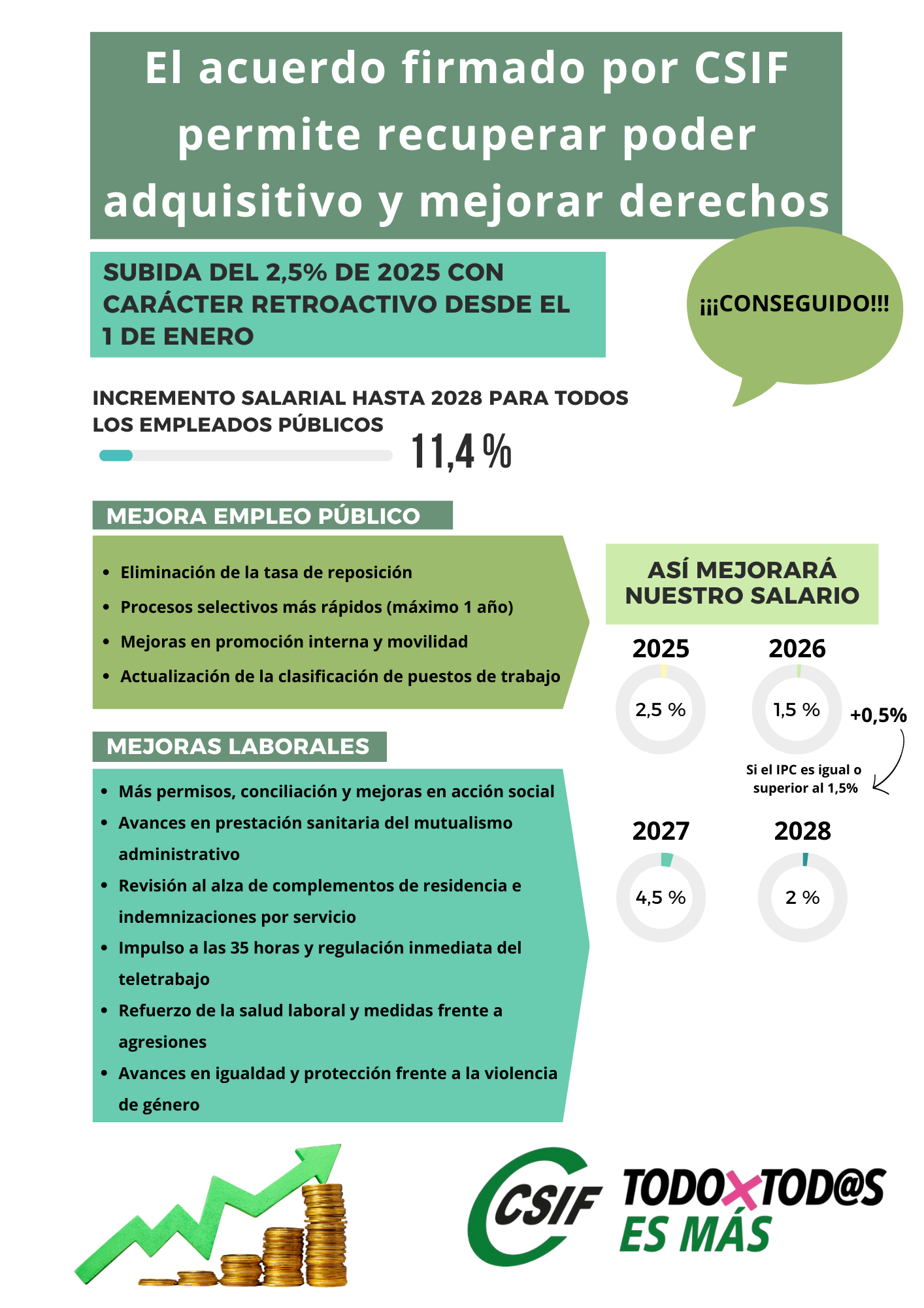 La Central Sindical Independiente y de Funcionarios (CSIF), sindicato más representativo en las administraciones públicas, se felicita por la aprobación en el Consejo de Ministros del Real Decreto Ley que permitirá abonar la subida de 2025 (2,5), los retrasos con efectos de 1 de enero de este año y la subida de 2026.