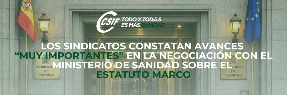 Las organizaciones sindicales con representación en el Ámbito de Negociación (SATSE-FSES, FSS-CCOO, UGT, CSIF y CIG-Saúde) han constatado hoy, en una nueva reunión del Ámbito de Negociación, avances “muy importantes” por parte del Ministerio de Sanidad en la negociación de asuntos esenciales que debe contemplar el Estatuto Marco del personal estatutario de los servicios de salud.