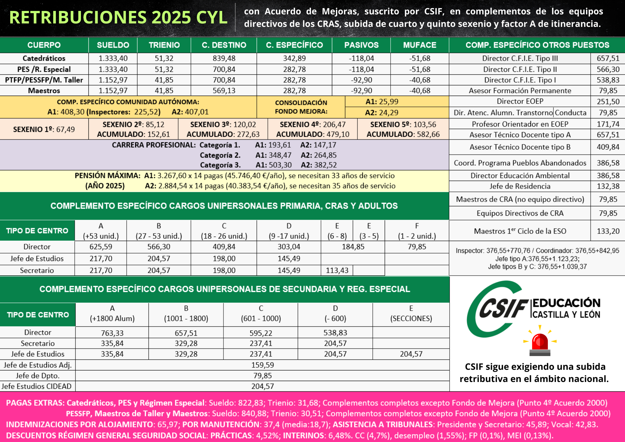 CSIF INFORMA: Cuadro de retribuciones docentes vigentes en 2025 en CyL.