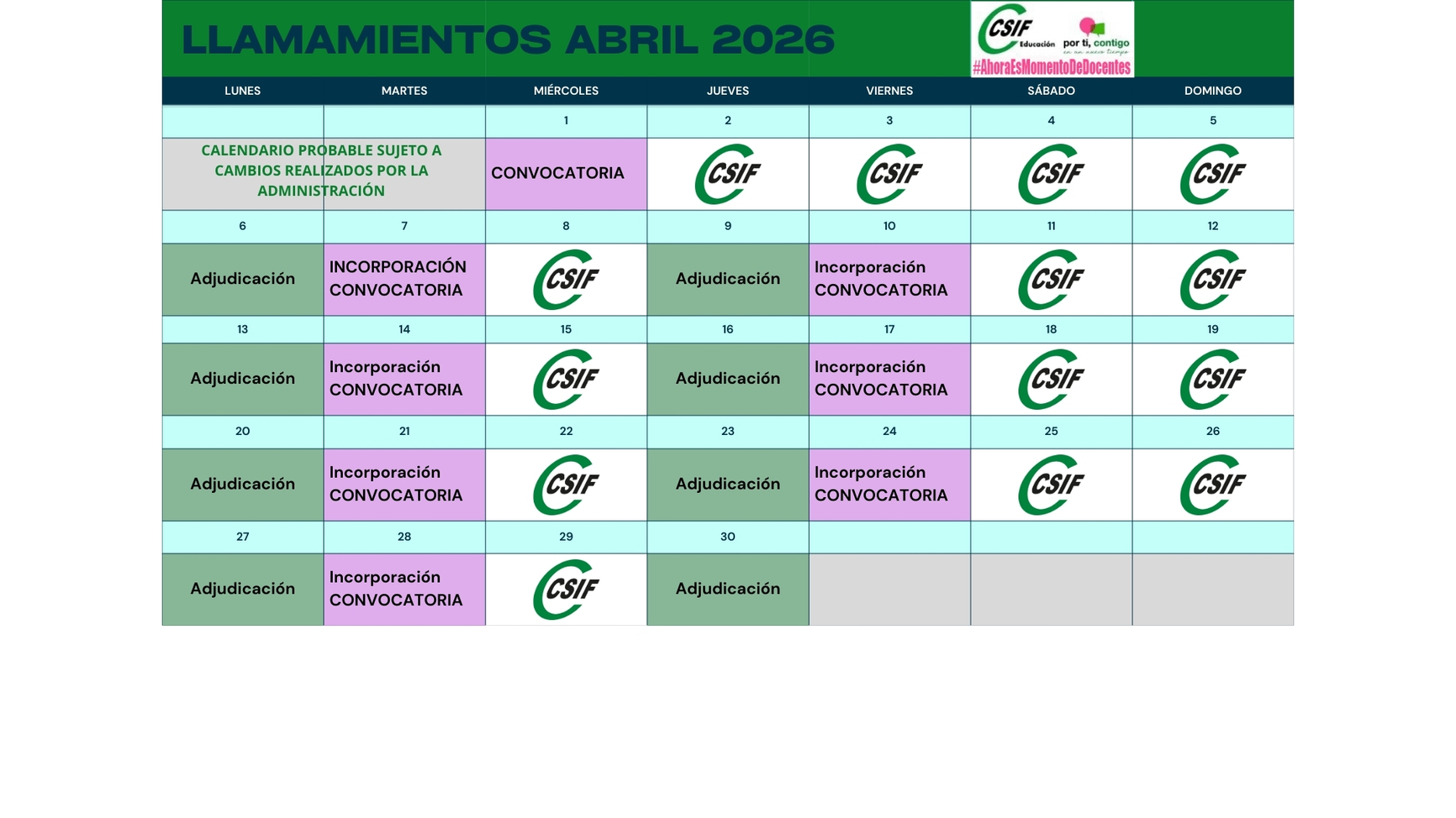 CSIF te ofrece toda la información de los llamamientos telemáticos del curso escolar 2025/2026. Calendario PROVISIONA, sujeto a CAMBIOS realizados por la administración.