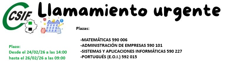 LLAMAMIENTO URGENTE: 24/02/2026. Varias especialidades. Plazo: Desde el 24/02/26 a las 14:00 hasta el 26/02/26 a las 09:00