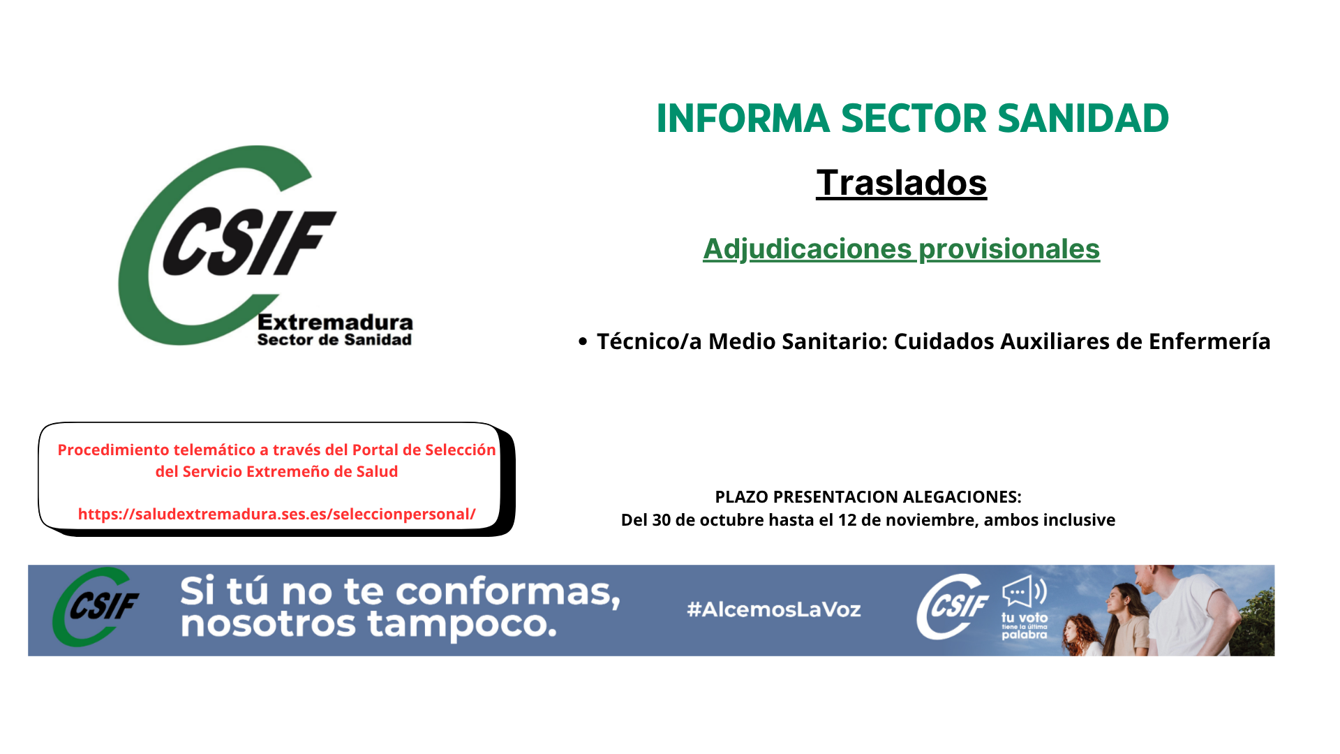 Publicada en el Diario Oficial de Extremadura (https://doe.juntaex.es/index.php), con fecha 29 de octubre de 2025, Resolución de 24 de octubre de 2025, de la Dirección Gerencia del Servicio Extremeño de Salud, por la que se hacen públicas las adjudicaciones provisionales en el concurso de traslado para la provisión de plazas básicas vacantes en la categoría de: