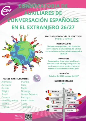 BOE 28/11/2025: Convocatoria de plazas para auxiliares de conversación españoles en el extranjero para el curso académico 2026-2027