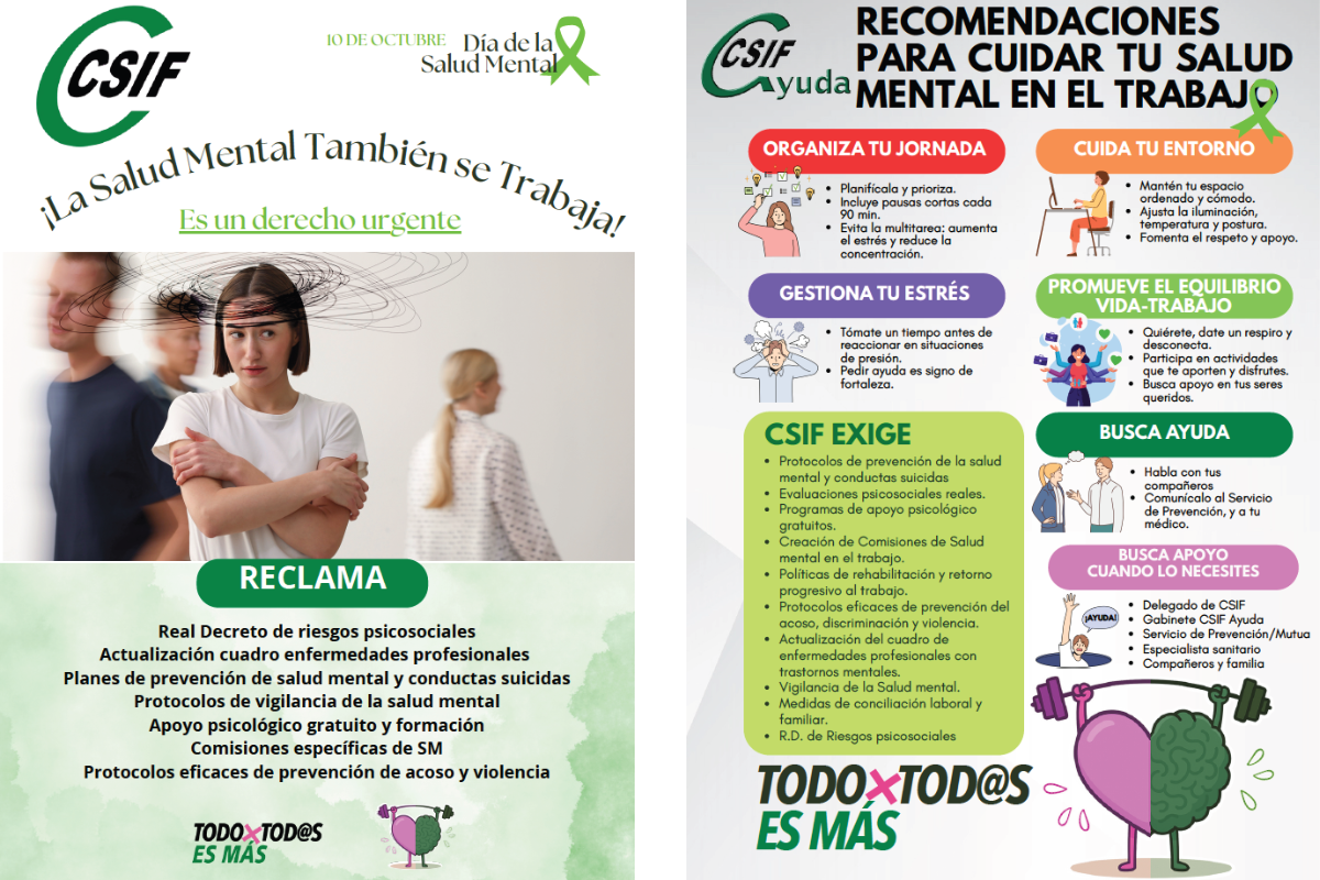 Por eso, este 10 de octubre, CSIF recuerda que “la salud mental también se trabaja”, y que su defensa empieza en los centros de trabajo, con políticas preventivas, recursos reales y un cambio cultural profundo.