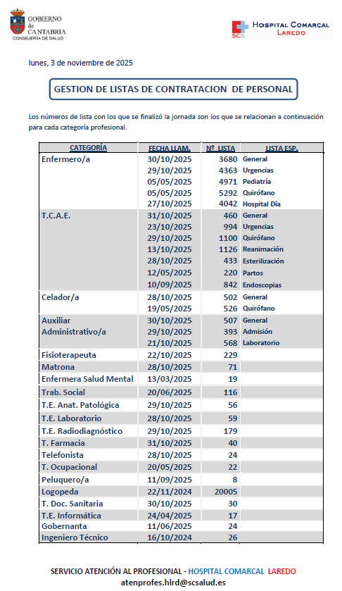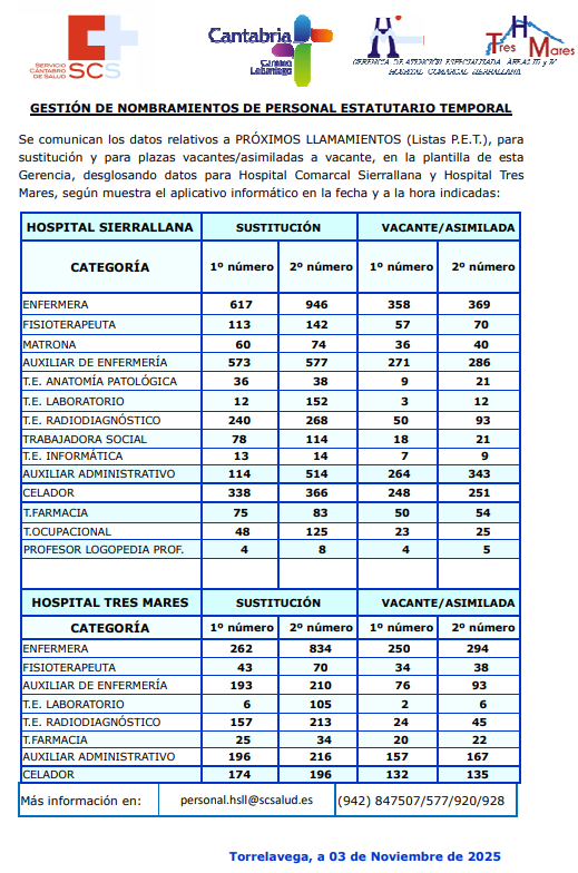 Llamamientos Bolsa de Contratación del SCS. Semana 3 de noviembre de 2025