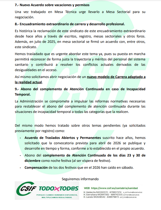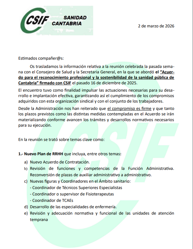 CSIF se reúne con el Consejero de Salud para abordar el “Acuerdo para el reconocimiento profesional y la sostenibilidad de la sanidad pública de Cantabria” firmado con CSIF el pasado 16 de diciembre de 2025