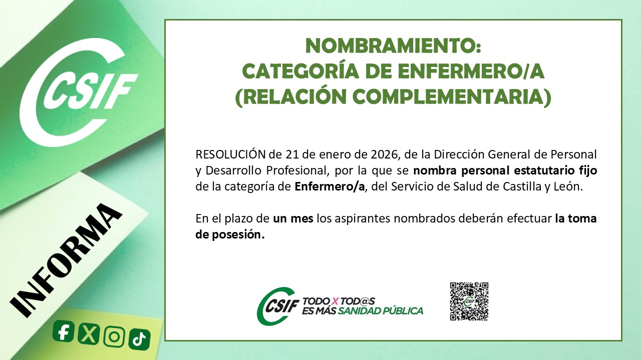 NOMBRAMIENTO: personal estatutario fijo de la categoría de Enfermero/a (relación complementaria).