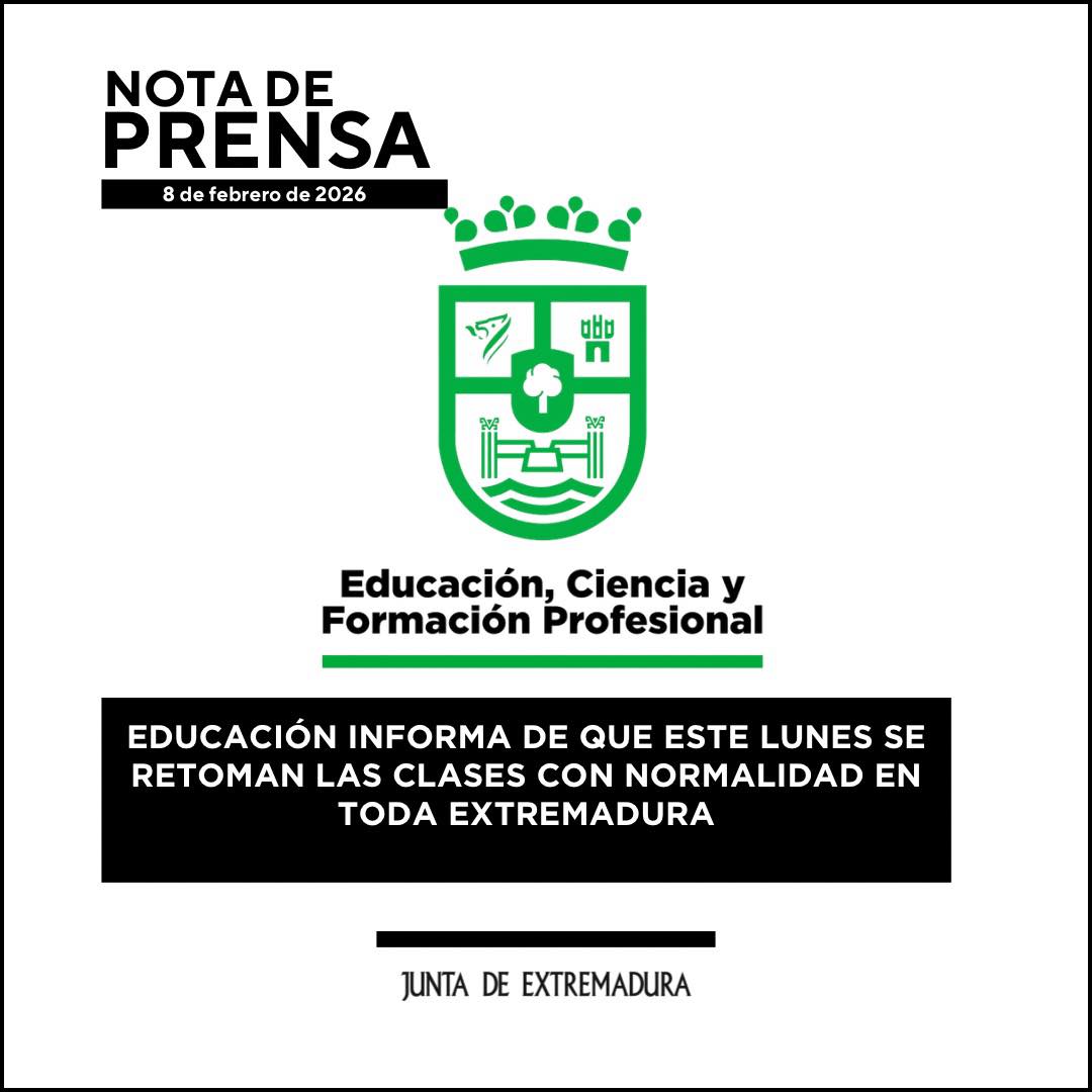 Según nos informan desde el 112, y dadas las actuales condiciones meteorológicas e hidrológicas, MAÑANA, 9 de febrero, habrá CLASES con NORMALIDAD en toda EXTREMADURA..