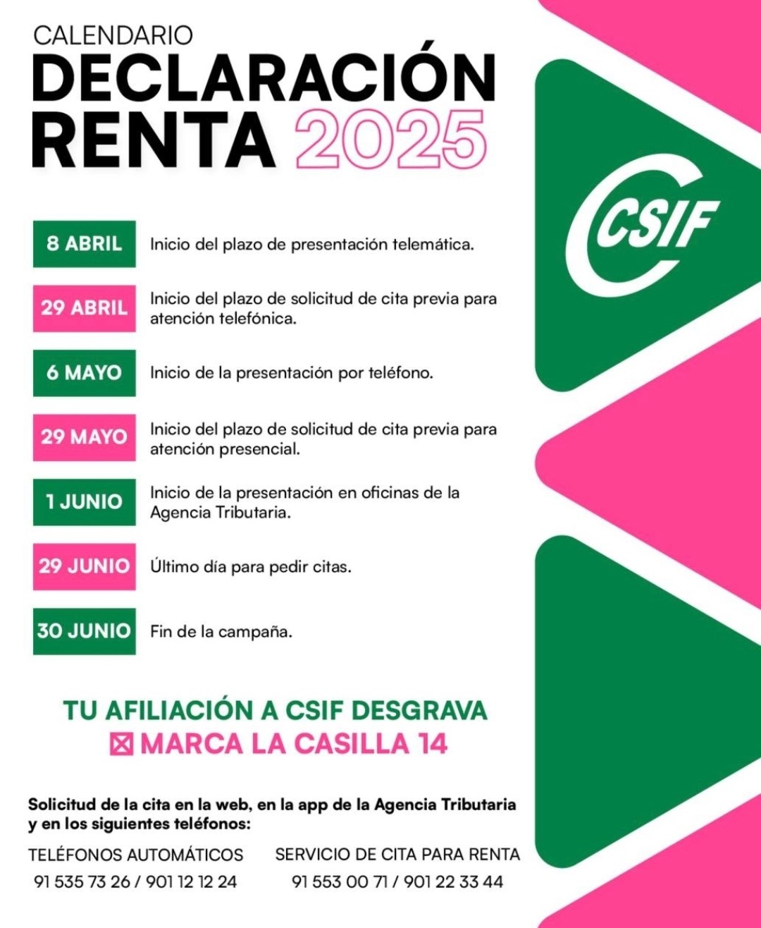Os informamos de que, a partir del 8 de abril, todos los afiliados/as que lo deseen podrán descargarse a través de la página web de CSIF los certificados de la cuota sindical de cara a la Declaración de la Renta. Como ya sabéis la afiliación desgrava.
