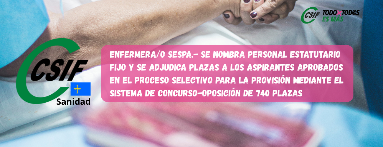 ENFERMERA/O SESPA.- se nombra personal estatutario fijo y se adjudica plazas a los aspirantes aprobados en el proceso selectivo para la provisión mediante el sistema de concurso-oposición de 740 plazas