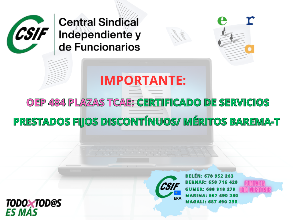 IMPORTANTE: OEP 484 PLAZAS TCAE: CERTIFICADO DE SERVICIOS PRESTADOS FIJOS DISCONTÍNUOS/ MÉRITOS BAREMA-T