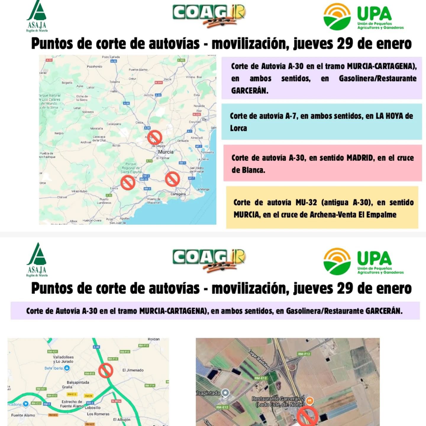 Uno de los principales cortes se producirá en la A-30 a la altura de la gasolinera-restaurante Garcerán, en ambos sentidos, lo que afectará a la circulación entre Murcia y Cartagena, así como a los accesos a Alcantarilla, Molina de Segura y la Vega del Segura.