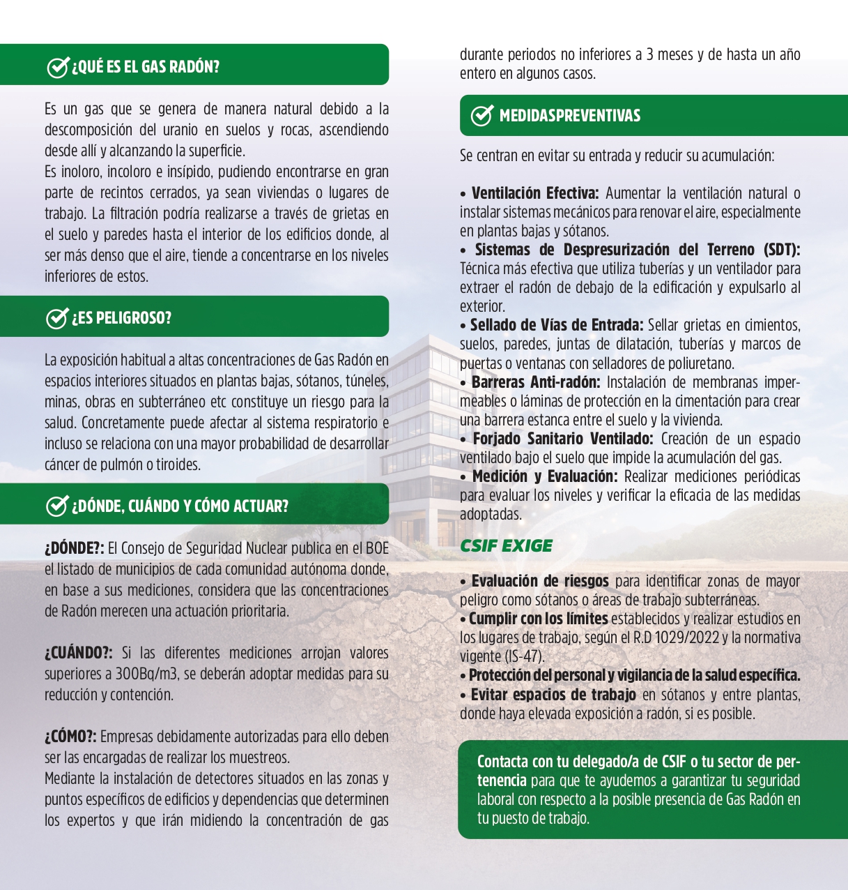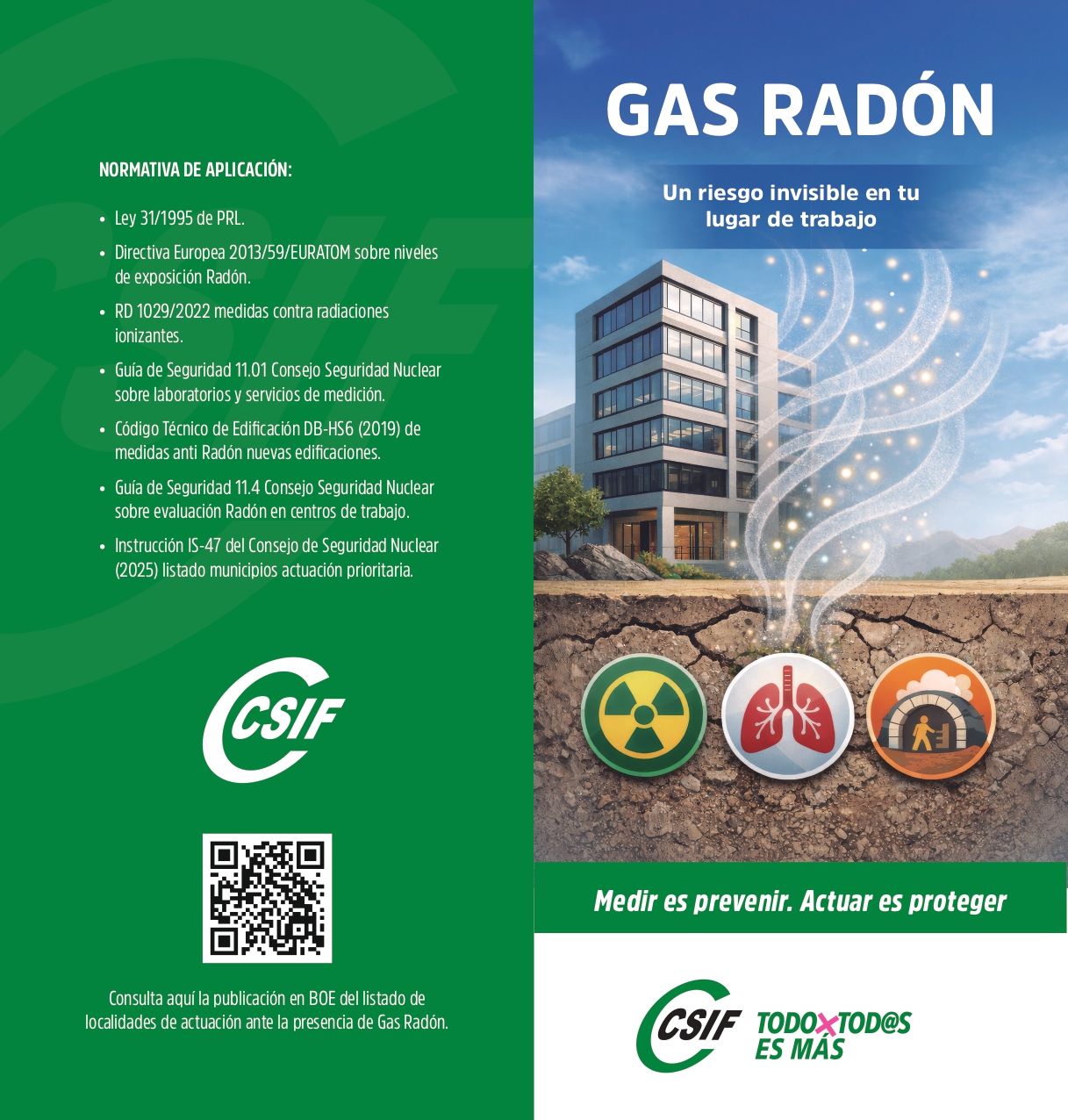 “Medir es prevenir. Actuar es proteger” con esta campaña, CSIF quiere trasladar un mensaje claro: el radón no se ve, no huele y no avisa. La única forma de prevenir es