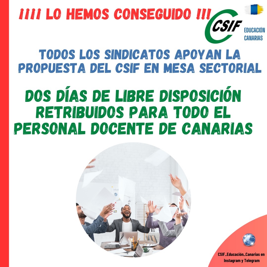 - "El sindicato CSIF exige dos días de libre disposición para docentes canarios: «No genera ningún sobrecoste»" canarias7.es