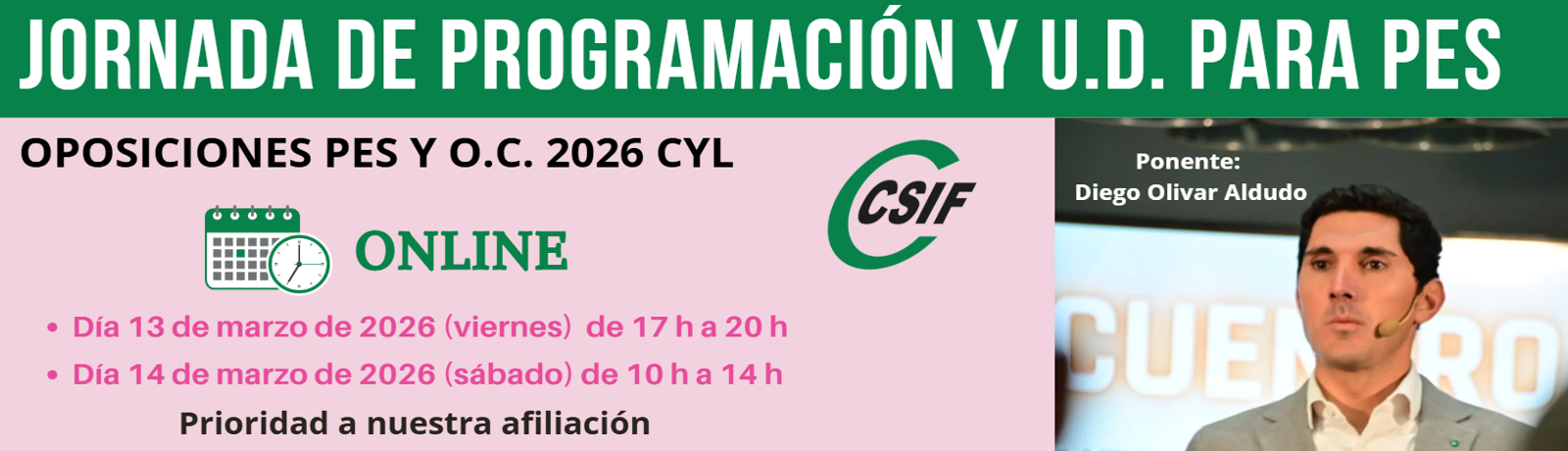 Desde CSIF, es nuestro deseo estar al lado de los compañer@s opositor@s y ayudaros a plantear la elaboración de la programación y de las U.D. Por tanto, hemos decidido organizar estas sesiones gratuitas y on line, a las que como siempre tendrá preferencia en el acceso nuestra afiliación, con dos charlas de sumo interés impartidas por Diego Olivar Aldudo.
