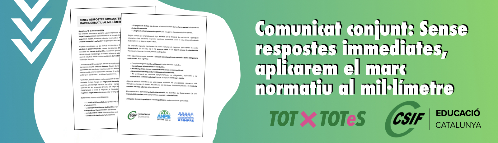 CSIF, ANPE i ASINPRE reclamen acords calendaritzats urgents i anuncien l’aplicació estricta del marc normatiu si el Departament i sindicats de mesa continuen dilatant les solucions.