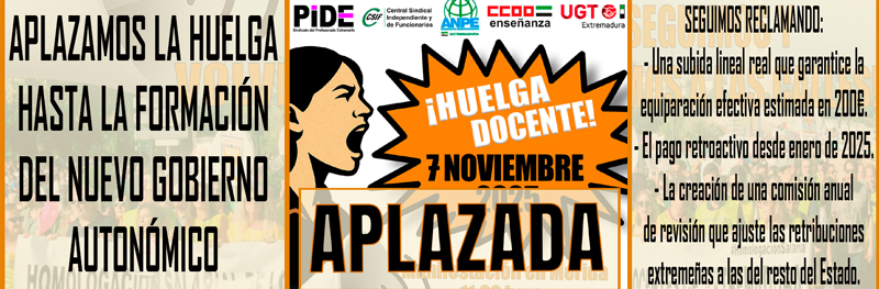 Las cinco organizaciones sindicales con representación en la Mesa Sectorial de Educación Pública no Universitaria de Extremadura —PIDE, CSIF, ANPE, CCOO y UGT Servicios Públicos— tras reunirnos de urgencia ante el adelanto electoral autonómico y disolución de la Asamblea de Extremadura publicado hoy en el DOE (Decreto de la Presidenta 8/2025), hemos decidido APLAZAR la huelga y manifestación que habíamos convocado legalmente para el 7 de noviembre. Consideramos que por responsabilidad es más apropiado retomarla cuando se conforme un nuevo gobierno en Extremadura.