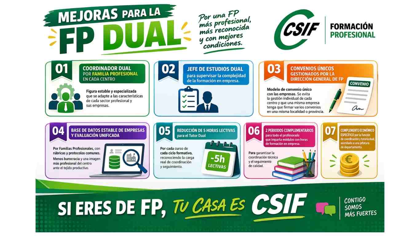 - Que la gestión y firma de los convenios sea asumida directamente por la Dirección General de FP, estableciendo un modelo de convenio único con las empresas. Esta medida busca evitar que cada centro gestione acuerdos de forma individual, impidiendo que una misma empresa deba suscribir convenios con varios institutos de una misma localidad o provincia.