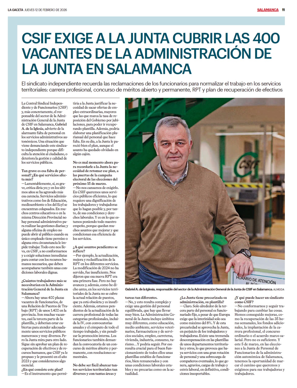 CSIF exige a la Junta cubrir las 400 vacantes de su administración en Salamanca
