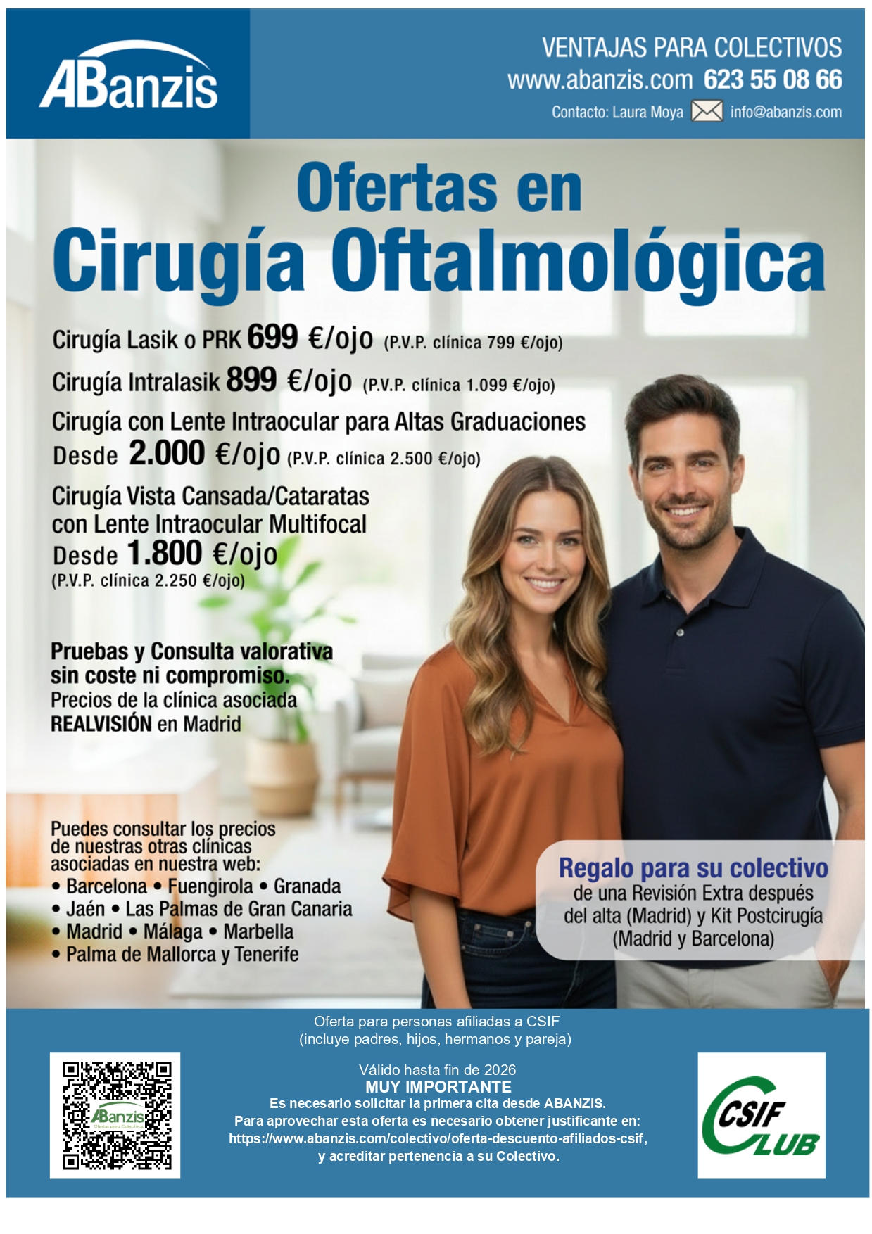 Aprovecha las ventajas que hemos negociado con ABanzis para todo este año 2026: Cirugía Lasik, Intralasik, con lente intraocular, para vista cansada...