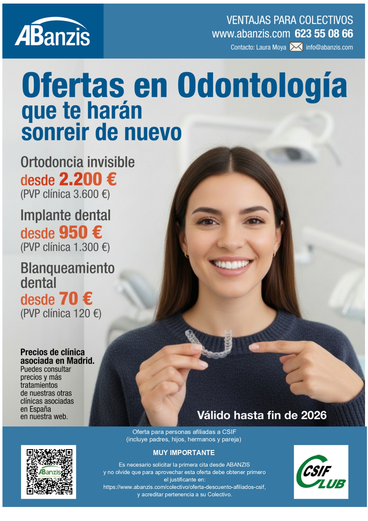 Gracias al acuerdo al que hemos llegado con ABanzis, podemos ofrecerte los mejores precios en odontología: ortodoncia invisible, implantes dentales, blanqueamiento...
