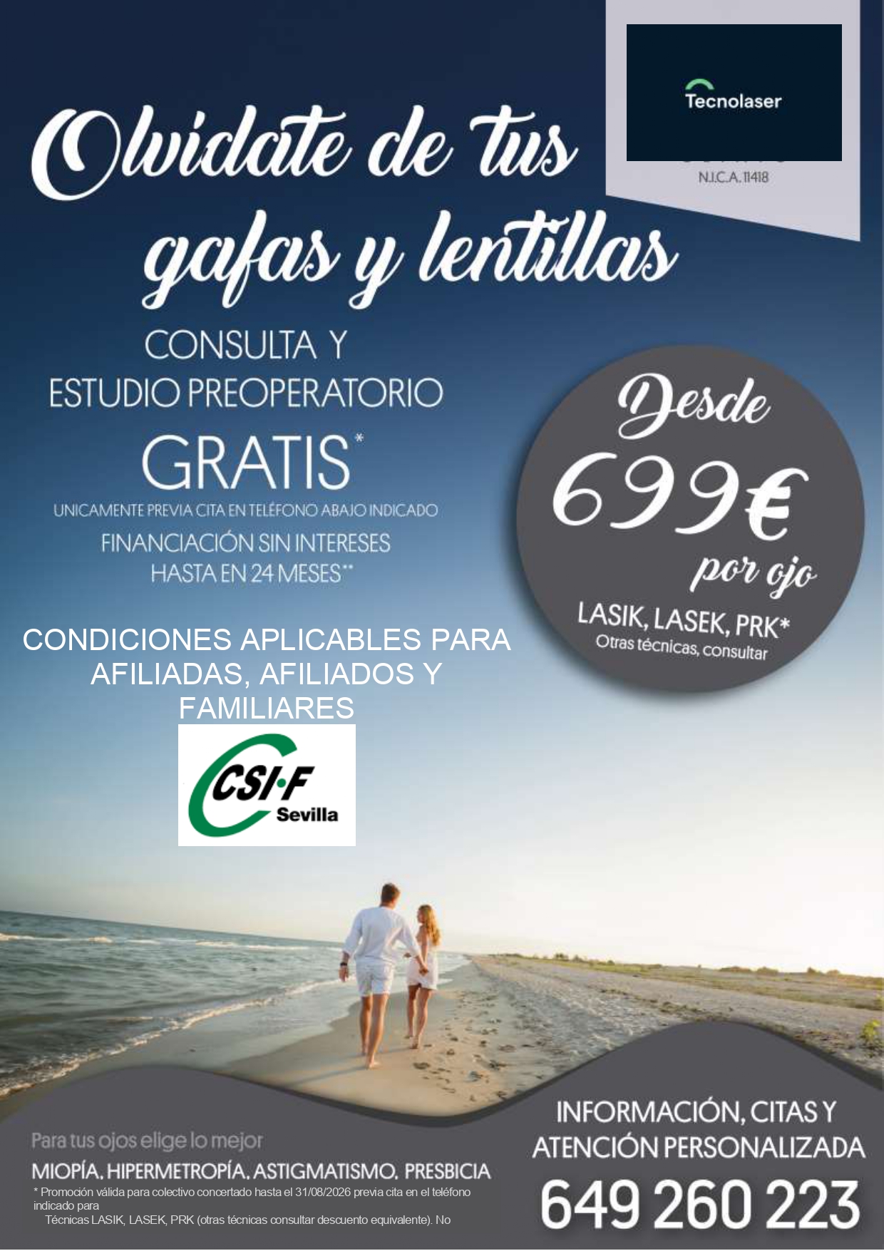 TECNOLÁSER CLINIC VISION,  referente nacional en oftalmología, ofrece sólo a través de la línea telefónica específica para ello, abajo indicada, unas condiciones especiales a los afiliados a CSIF Sevilla y familiares directos, para la corrección en minutos del defecto refractivo de la miopía, hipermetropía, astigmatismo así como tratamientos para presbicia o vista cansada.