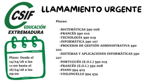 LLAMAMIENTO URGENTE: 14/04/2026. VARIAS ESPECIALIDADES. Plazo: Desde el 14/04/26 a las 11:00 hasta el 16/03/26 a las 09:00