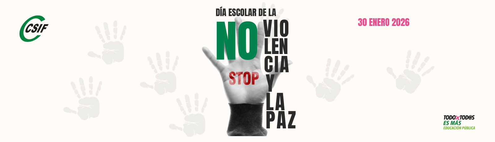 El día 30 de enero de 2026 CSIF, junto con el resto de la comunidad educativa en nuestro país, conmemoramos el Día Escolar de la No-Violencia y la Paz, establecido en el año 1964. Este día evidencia un compromiso de la educación por la no-violencia y un compromiso con la educación para la paz. Para CSIF, la educación pública es el entorno de aprendizaje vital, la correa de transmisión de valores de valores de respeto, igualdad y solidaridad.
