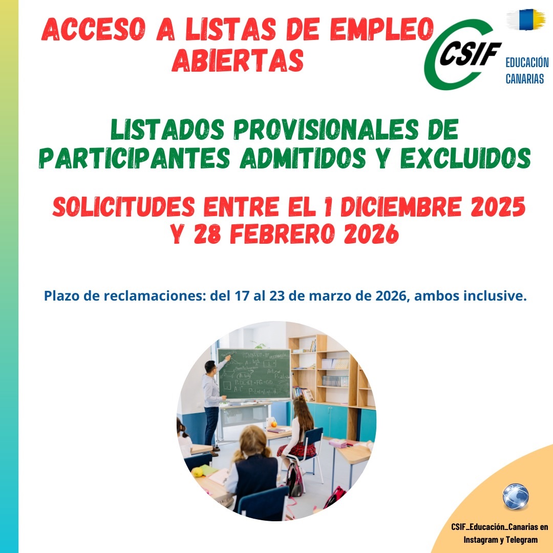 ACCESO A LISTAS DE EMPLEO ABIERTAS 2026. PUBLICADOS LOS LISTADOS PROVISIONALES DE ADMITIDOS Y EXCLUIDOS. SOLICITUDES ENTRE EL 1 DE DICIEMBRE 2025 Y 28 DE FEBRERO DE 2026.