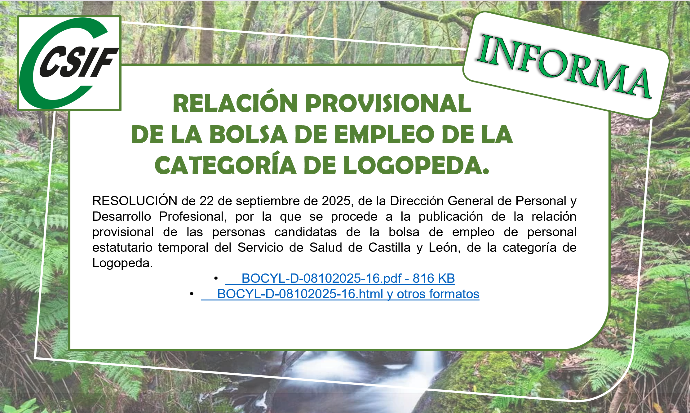 RESOLUCIÓN de 22 de septiembre de 2025, de la Dirección General de Personal y Desarrollo Profesional, por la que se procede a la publicación de la relación provisional de las personas candidatas de la bolsa de empleo de personal estatutario temporal del Servicio de Salud de Castilla y León, de la categoría de Logopeda.