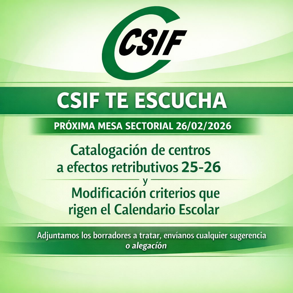 MS 26-2-2026.-Convocada mesa sectorial para tratar: Catalogación de centros a efectos retributivos 25-26 y Modificación criterios que rigen el Calendario Escolar