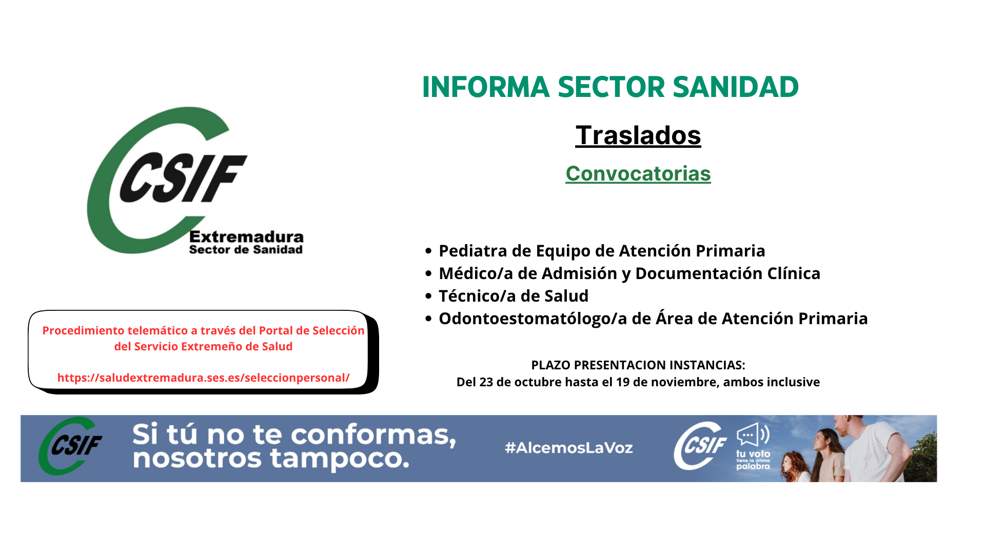 CSIF Informa de la publicación en el Diario Oficial de Extremadura, con fecha 22 de octubre de 2025, de las Resoluciones de 13 de octubre de 2025, de la Dirección Gerencia del Servicio Extremeño de Salud, por las que se convocan concursos de traslados en las categorías de:
