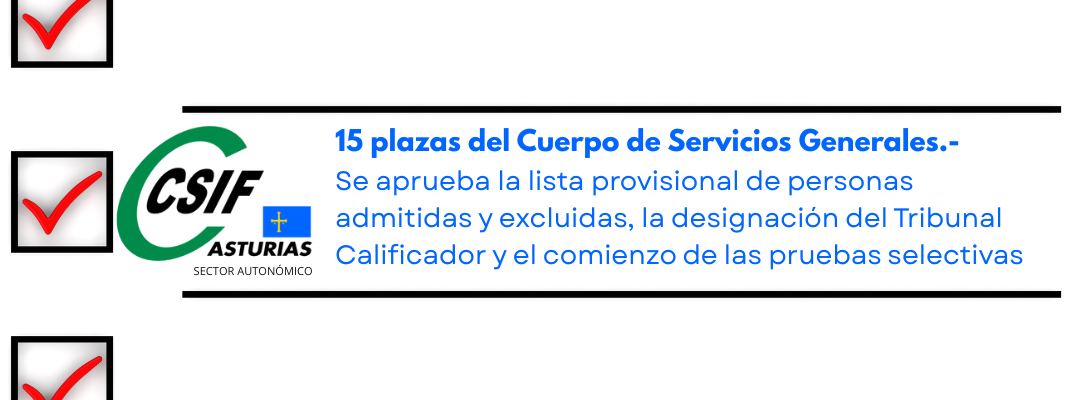 15 plazas del Cuerpo de Servicios Generales, Grupo C, Subgrupo C2, en turno de acceso libre y turno de promoción interna, en régimen de funcionario/a de carrera. Se aprueba la lista provisional de personas admitidas y excluidas, la designación del Tribunal Calificador y el comienzo de las pruebas selectivas