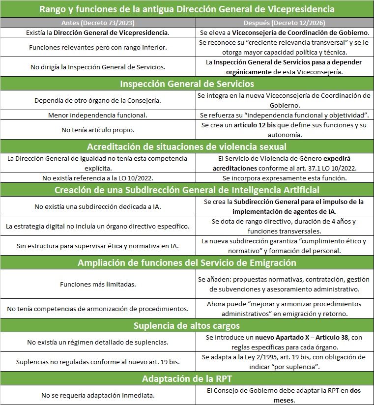 La antigua Dirección General de Vicepresidencia se eleva a rango de Viceconsejería para asumir funciones transversales clave: